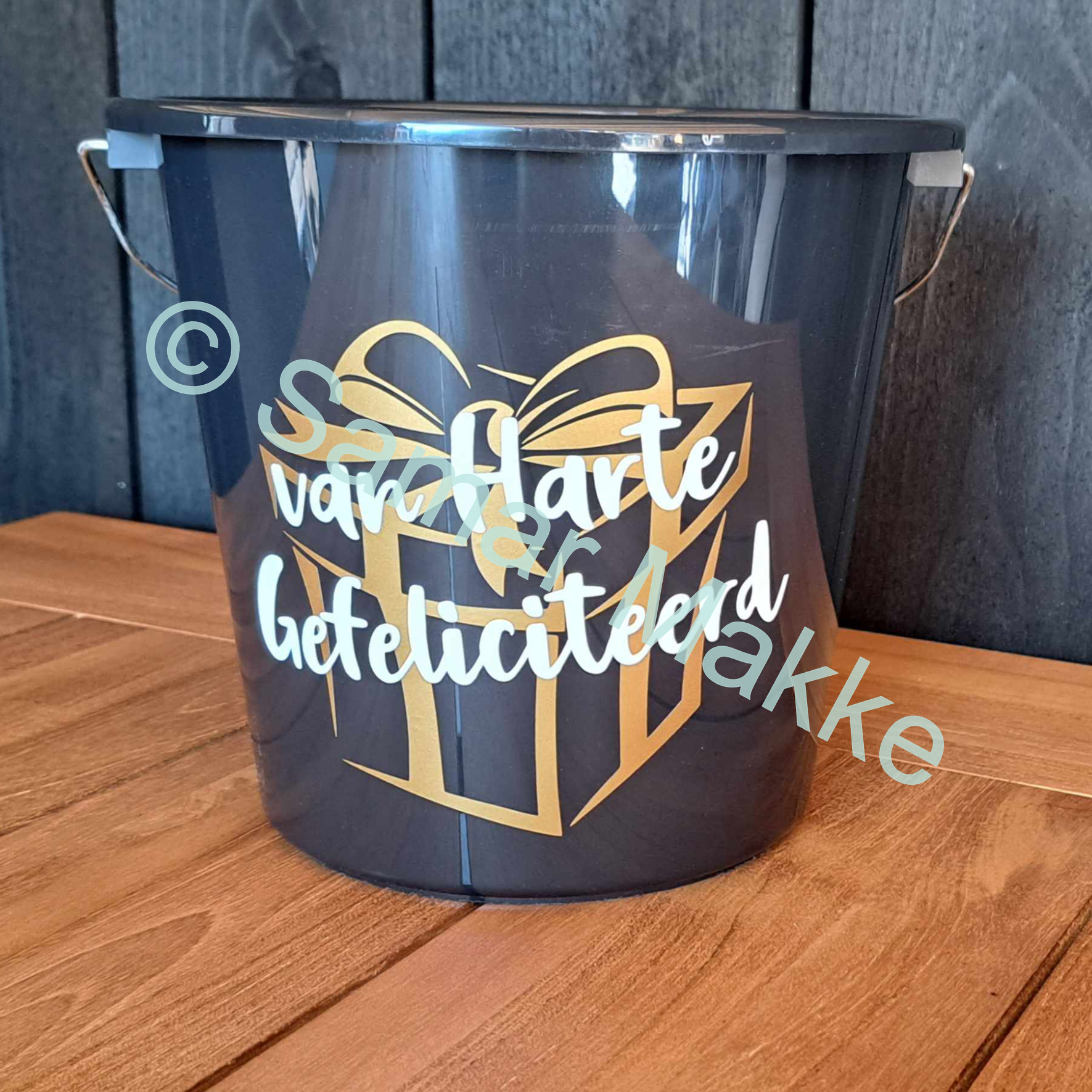 Vul de emmer met: Bier, Wijn, Koffie, Thee, borrelnootjes, etc. of vul de emmer met wat de ontvanger lekker vind, verpak hem in folie en je hebt een geweldig cadeau.