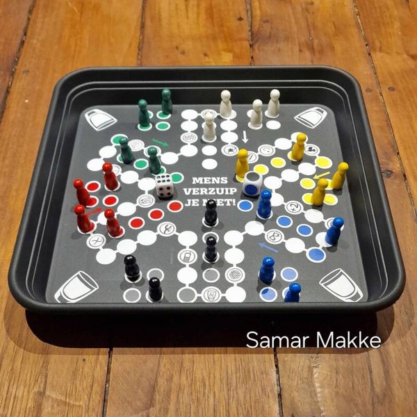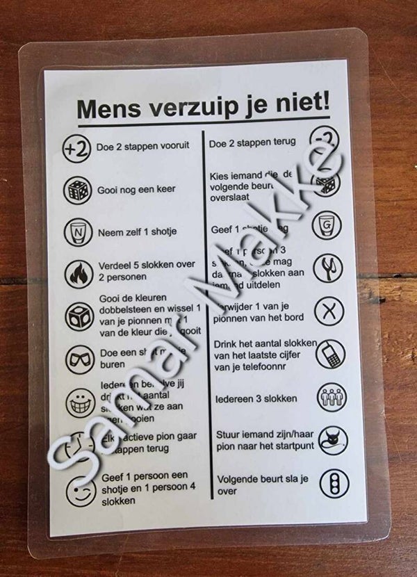 MENS VERZUIP JE NIET, hilarisch spel gebaseerd op mens erger je niet maar met (drink)opdrachten net zoals ganzeborden, erg leuk om met een stel vrienden of familie te spelen. Spel is met spelregels