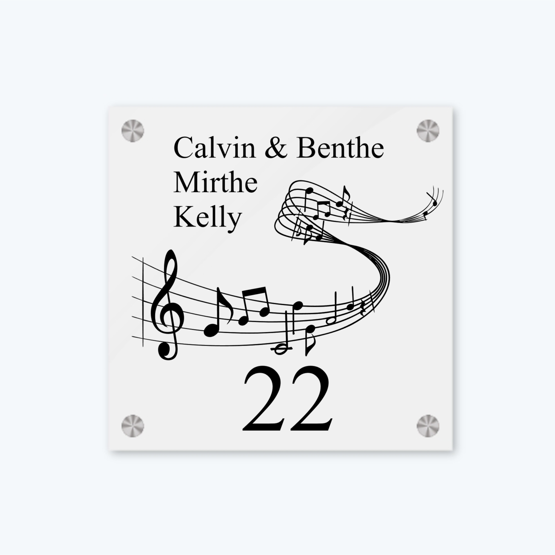 Naambordje van plexiglas, in de kleuren wit, zwart, transparant of RVS look.